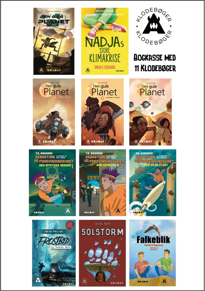 Bogkasse med KRABATs 11 KlodebøgerDen gule planet trilogiDen blå planet trilogiDen grå planetNadjas store klimakriseSebastian og forsvindingsuret trilogiFrostbidSolstorm Spar 30% ved at købe bogkassen