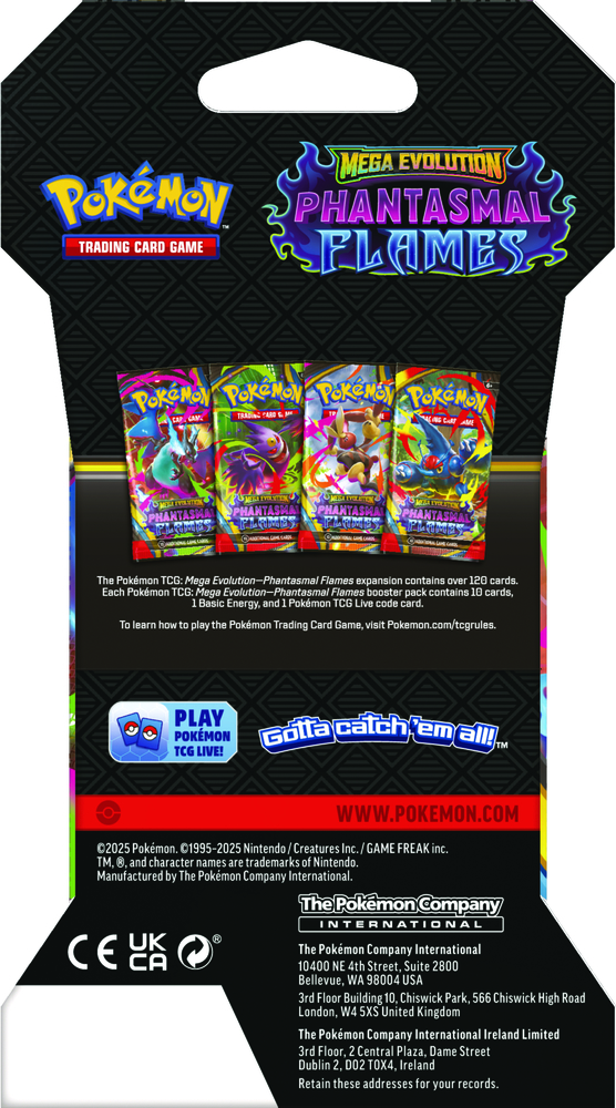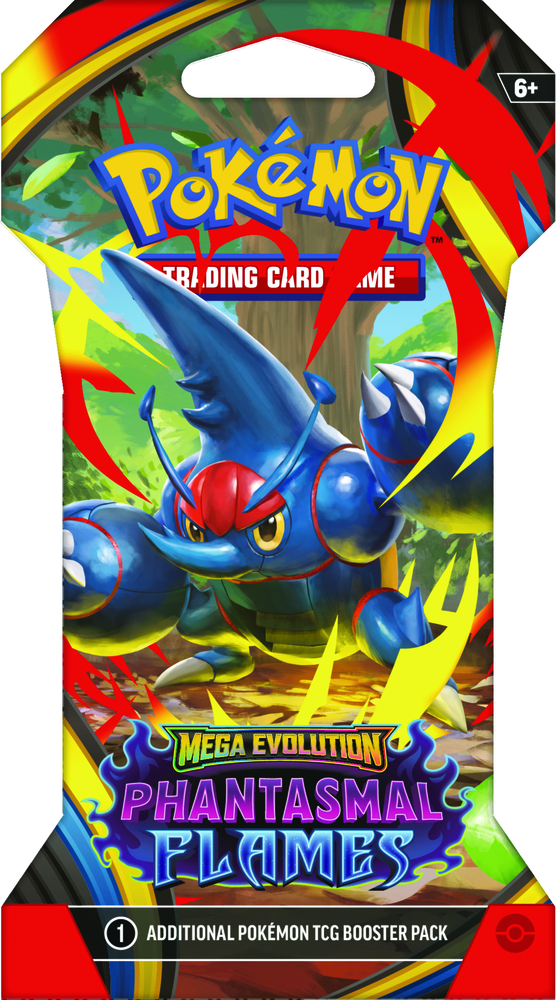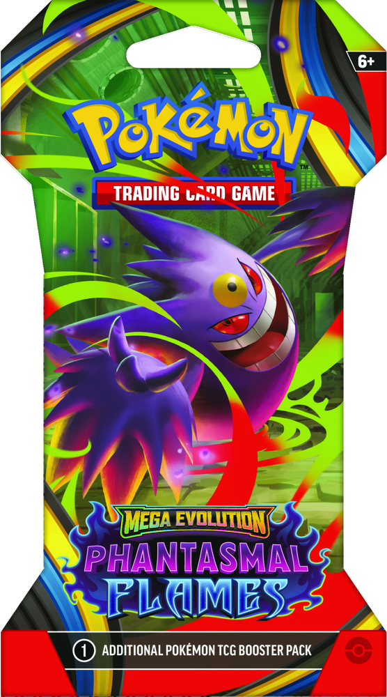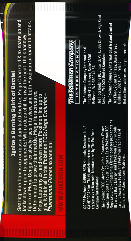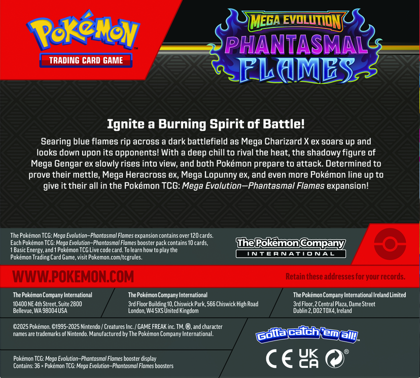 Skærende blå flammer river hen over en mørk slagmark, mens Mega Charizard X ex svæver op og ser ned på sine modstandere! Med en kuldegysning, der kan matche varmen, rejser den skyggefulde silhuet af Mega Gengar ex sig langsomt, og begge Pokémon gør sig klar til angreb. Fast besluttet på at bevise deres værd stiller Mega Heracross ex, Mega Lopunny ex og endnu flere Pokémon sig op for at give alt, hvad de har, i Pokémon TCG: Mega Evolution-Phantasmal Flames-udvidelsen!
