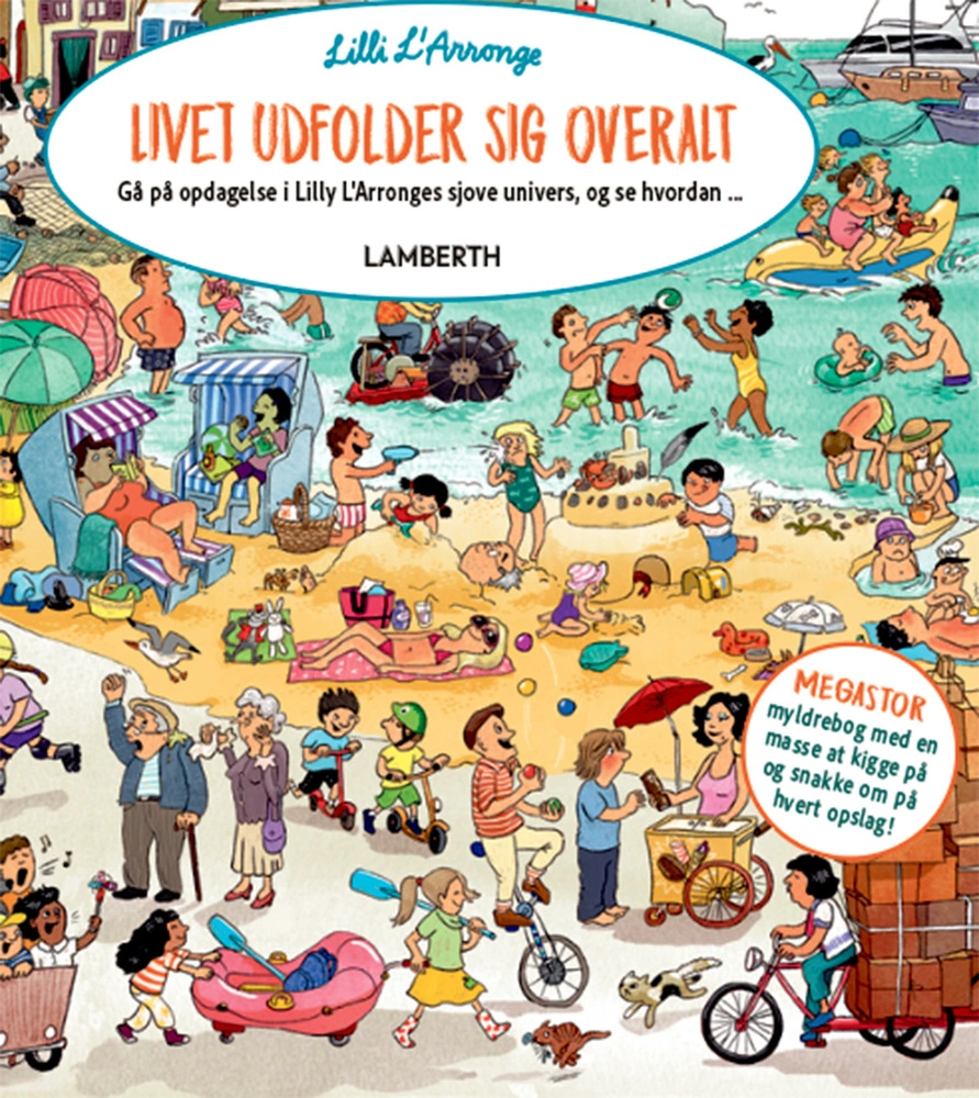 Panorama-papbog, der kan udfoldes til 420x420 mm, med store detaljerige illustrationer, man kan fordybe sig i og digte historier om. Find den lille abe, som gemmer sig i mylderet på hvert billede.
